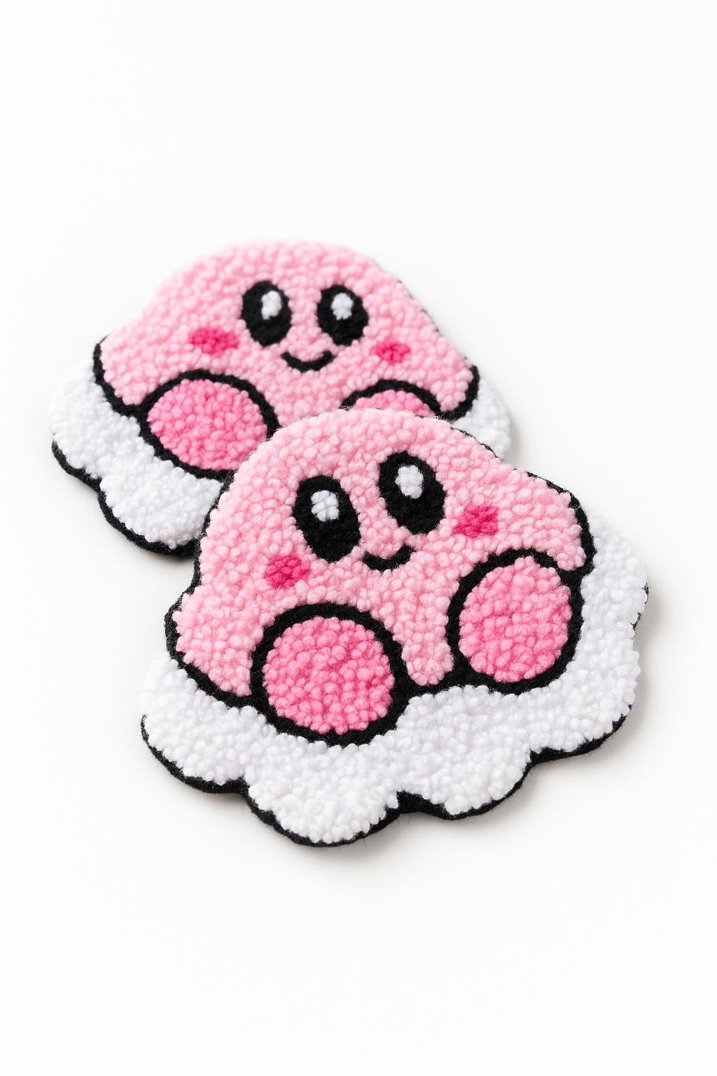 Bring a little bit of the gaming world into your home with this adorable Kirby Mug Rug. These two handcrafted coasters are designed to look like the lovable Kirby in his cloud form, complete with his signature pink body, big eyes, and rosy cheeks. The tufted texture gives them a soft, plush feel, while the white cloud border adds a charming detail. Perfect for protecting your surfaces from coffee rings and spills, these mug rugs are a must-have for any video game fan or anyone who loves cute and whimsical decor.
