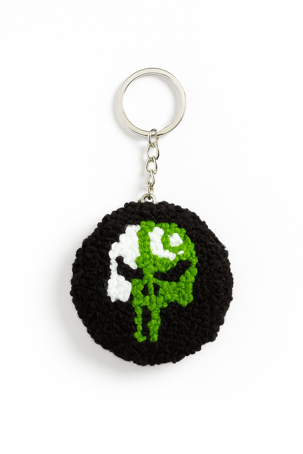 Carry a piece of unique, patriotic style with this striking Pakistan Flag Skull Keychain. This keychain features a hand-tufted, round design with a bold skull motif in the iconic green and white colors of the Pakistani flag. The dark tufted base adds a rich, textured feel, making it a tactile and eye-catching accessory. Perfect for your keys, bag, or backpack, this keychain is a unique way to showcase your heritage with an artistic and modern edge.