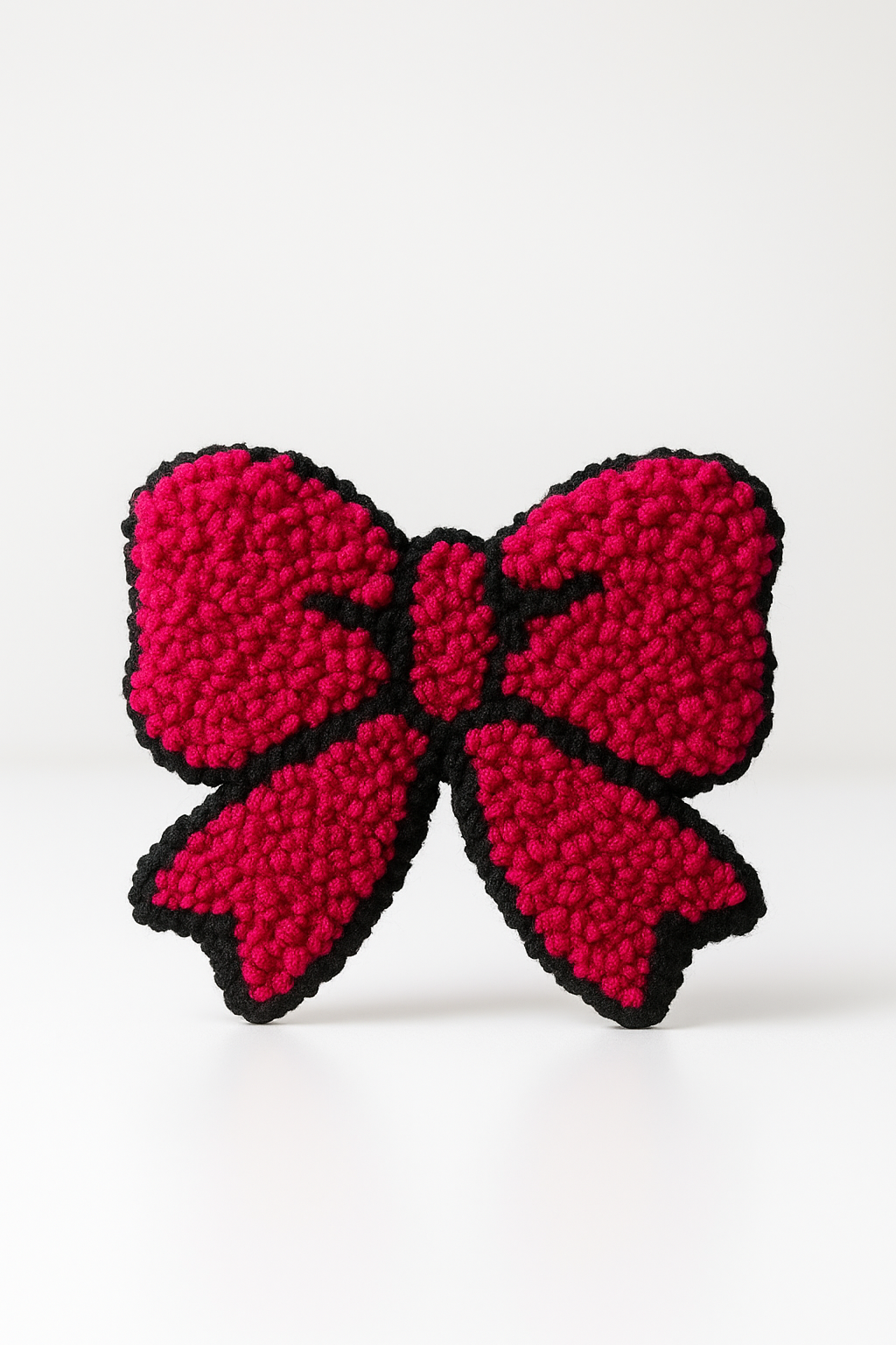 Add a touch of playful charm to your daily routine with this adorable Ribbon Punch Needle Mug Rug. This handcrafted mug rug features a whimsical bow design, made with a plush, tufted texture. The rich, deep red color is beautifully outlined in black, giving it a bold and elegant look. Perfect for your coffee table or desk, this mug rug not only protects your surfaces from heat and spills but also adds a fun, decorative flair. It’s a unique and stylish accessory for anyone who loves cozy, handmade decor.