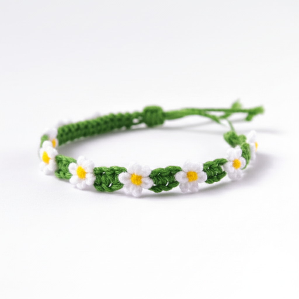 The design features delicate white wool flowers stitched onto a green band, creating a simple but eye-catching contrast. Whether you’re dressing casually or adding a soft detail to a more dressed-up look, this wristband fits effortlessly into your style. Lightweight and comfortable, it won’t irritate your skin, and it’s easy to put on and take off.